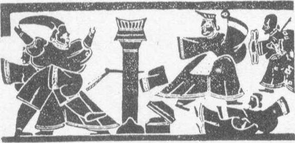 荆轲刺秦王 画像石Huaxiangshi用于构筑墓室、石棺、享祠、石阙的刻有不同画面的建筑材料。画像石是继承东周画像铜器和秦汉壁画、漆画而发展起来的一种在石器上造型的艺术形式。画像石肇始于西汉晚期,发展于新莽时期,鼎盛于东汉。画像石的发现和研究大体经历了三个阶段,第一个阶段从北宋到本世纪初,可称为金石学阶段,主要限于对画像石内容和题榜的著录,如北宋赵明诚的《金石录》,南宋洪适的《隶释》、《隶续》,本世纪初王昶的《金石萃编》、翁方纲的《两汉金石记》等。第二阶段从本世纪初到60年代,这时期的研究主要是对各地零散画像石的收集、整理和对地面遗存的初步考释、研究。第三阶段从60年代中期到现在,这时期的研究已进入了区域类型,系统分期断代和艺术风格的研究。汉画像石的分布主要集中于四个区域:❶山东、苏北、皖北; 画像石Hua xiangshi古代祠堂或墓室中刻有画像的石质装饰物,称为画像石。最初始于西汉,盛行于东汉,后逐渐减少。画像石多为在墓室建筑的石材上,雕刻出人物或动物,建筑或树木.表现历史事件、故事情节、社会生活和生产活动等。表现技法有多种,主要有阳刻和阴刻两类,构图简洁明确,造型形象生动,强调大型的轮廓和动态,粗犷质朴,自然成趣,富有浓厚的装饰意味。著名的画像石有武梁祠画像石和考堂山画像石,还有沂南的画像石墓的作品,也具有自己的特点。通过画像石的欣赏,可以使我们看到古代人的生活侧面,也是了解当时政治、经济、思想、文化与艺术的宝贵资料。