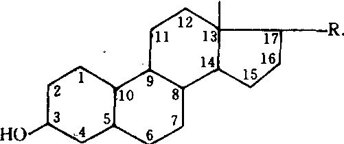 | 释义 | 甾醇即“固醇”。 甾醇sterol又称固醇。含羟基的环戊烷多氢菲类化合物。在环戊烷多氢菲的第3位上有一个羟基,第10和13位上各有一个甲基,第17位上有一个含8个或8个以上碳原子的脂肪族侧链的甾类化合物。“甾”字中的“田”表示环戊烷多氢菲的四个环,“巛”表示第10、13和17位上的3个取代基。结构式如下。广泛分布于动物、植物、酵母和其他菌类中,呈游离状态或与脂肪酸结合成酯。如动物中的羊毛甾醇、胆甾醇和7-脱氢胆甾醇;植物中的谷甾醇、豆甾醇、菜油甾醇和麦角甾醇。
