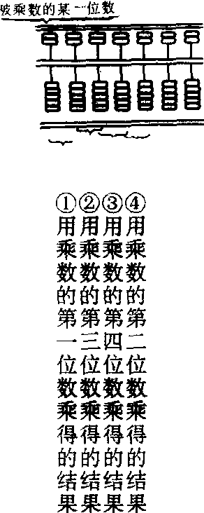 | 释义 | 086 留头乘筹算和珠算的多位数乘法中较为方便和广泛采用的一种。适用于乘数在三位以上的情况。亦称“穿心乘”。初见于元朱世杰著《算学启蒙》中。因将乘数首位数留至最后与被乘数相乘而得名。其方法是从乘数左起第二位开始,向右顺次与被乘数相乘,直至乘数的末位乘完,再用乘数的首位数与被乘数相乘,随加随乘,即得结果。如计算563×874,相乘的顺序是:3×70,3×4,3×800;60×70,60×4,60×800;500×70,500×4,500×800,积为492062。 留头乘Liutoucheng多位数相乘时,先用乘数的左起第二位上的数去乘被乘数的末位数, 再用乘数的左起第三位、第四位数……去乘被乘数的末位数,最后用乘数的最高位上的数去乘被乘数的末位数, 然后对被乘数的右起第二位、第三位……上的数依次按这一顺序进行运算。运算时,如果出现被乘数的某一位还没有同乘数的最高位数相乘, 而在被乘数的右一档上的乘积已满10或超过10时,暂不进位,要利用底珠或顶珠加以解决,直到乘数的最高位乘过之后,再把得数中的底珠或顶珠加以调整。这种算法因是从乘数的中间数字(第二位)起算,所以也叫做穿心乘。由于中国大部分地区做乘法时习惯使用“小九九”, 用乘数去乘被乘数的某一位数时, 把这位数保留到与乘数的每一位数乘完才“破掉”它,这样就可以减少错误,而且拨珠次数较少,运算速度较快, 还可以和除法中的归除互相还原, 因此自明代以来就是珠算乘法中流传最广的一种。其缺点是有时要用到底珠、顶珠,只能用七珠的大算盘,也比较难学。 |
