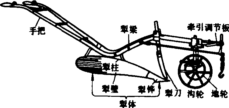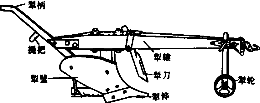 牲畜在前面牵引,耕者在后面手扶犁把跟着步行耕地的犁称为步犁(图2);犁上装有轮子,人能坐在犁上的称为乘犁或车犁。