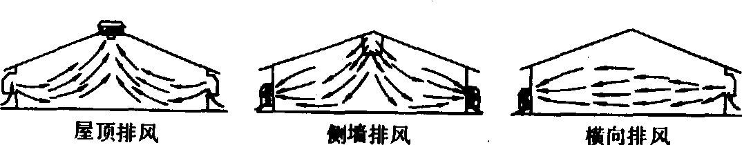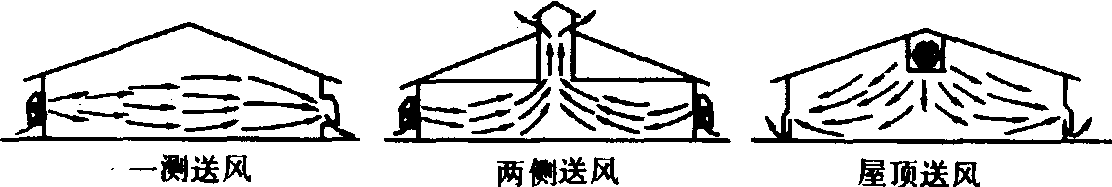 图1 负压通风形式示意 正压通风系统 又称进气式通风系统,是利用风机将新鲜空气强制送入舍内,使舍内空气压力大于外界大气压力,迫使舍内污浊空气经过排气口流出舍外,从而形成舍内外的空气交换。正压通风便于对进入畜舍的新鲜空气进行加热、冷却和过滤等预处理,能有效地保证舍内的适宜环境状态,空气分布也比较均匀。但这种通风方式比较复杂、造价较高,管理费用也较大。根据风机安装的位置可以分为侧壁送风和屋顶送风(图2)。侧壁送风又可分为一侧送风和两侧送风。一侧送风为穿堂风形式,适用于小跨度畜舍,而两侧送风则适用于大跨度畜舍。屋顶送风由安装在屋顶的风机送风,从两侧壁的排风口排风。