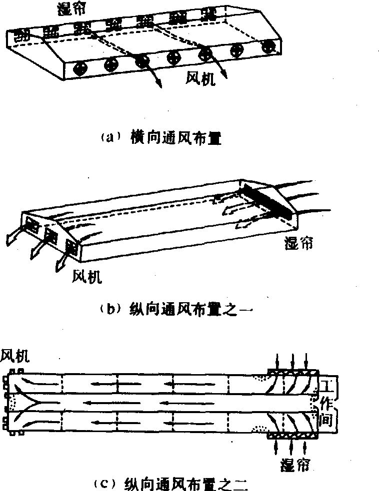图1 湿帘风机降温系统通风布置形式 纵向通风型式,是将畜舍的换气风机全部集中在畜舍一端的山墙上或两侧纵墙上向舍外排气。在畜舍另一端设进气口(可附设湿帘),使进入畜舍的新鲜空气沿畜舍纵长方向平稳地流动,气流分布均匀,通风死角少,畜禽四周的气流速度可达0.5~1.0米/秒。纵向通风在夏季能取得良好的通风降温效果,在装有湿帘降温时一般可使舍内空气温度下降3~7℃,舍内相对湿度在80%左右。此系统也可适用于有窗式或卷帘式畜舍,但运行时必须关闭窗户或放下卷帘。对于中小型畜舍,可以采取正压通风形式,选用由湿帘和风机组成的小型蒸发冷风箱装置,设置塑料风管,实现均匀送风。 蒸发湿帘降温系统宜选用全压低、流量大、耗电省、噪音低、安装方便和运行可靠的农用轴流风机。为便于运行调节和节省基建投资,常采用大小风机组合的型式。