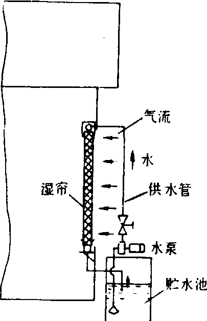 图3 畜棚湿垫风机降温系统 湿帘材料 常用的有白杨木刨花和湿强纸波纹湿帘两种。白杨木刨花吸水性好,降温效率高,经济实用。增大白杨木刨花湿帘的厚度和密度,可以提高降温效率,但同时也增加了通风阻力,所以要保持适宜的白杨木刨花湿帘的密度和厚度。这种湿帘容易沉陷、塌落,积聚灰尘,会降低其降温效率,一般需要每年更换一次。湿强纸波纹湿帘是用专门的湿强纸压制成斜波纹状后,上下两层波纹走行不同的波纹纸交叉粘结成型的结构。它的吸水性能好,换热表面积大,具有降温效率好(可达80%以上),通风阻力小,机械强度较高,整体性能好,安装方便等优点。通常采用的湿强纸波纹湿帘厚100~120毫米,高1200~1600毫米。其成本比白杨木湿帘高,但在相同的通风工况条件下,需要设置的湿帘面积较小,而且一般可连续使用3~5年。 |