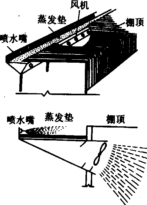 图2 蒸发湿帘装置 水平式蒸发湿垫,是在水平的金属网上铺上白杨木刨花(图3),一般在水平湿垫的下后方设置一排小风机,从某一定角度向棚内吹风,有3~5层金属网就能满足降温要求。