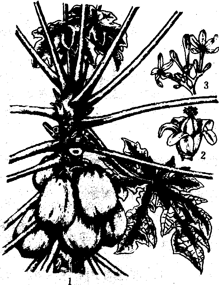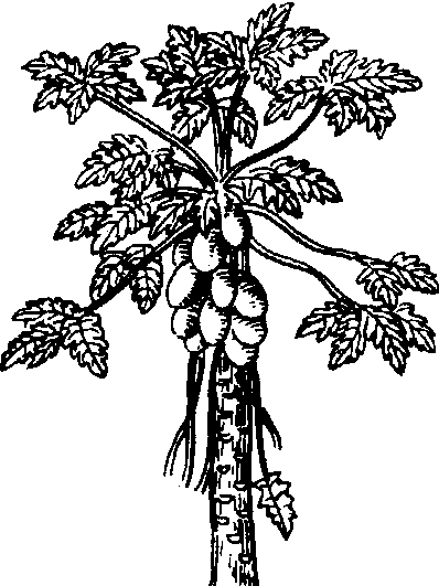 栽培技术要点 繁殖采用种子播种育苗。选留种必须经过群体选、株选、果选和苗选, 去劣选优。制种可用两性花或雌花作母本,取两性花的花粉授粉,以保证后代绝大部分是两性株或雌株。果园发现雄株宜及时砍除。广东在秋末冬初播种,用营养钵育苗,搭薄膜棚防寒越冬,次年春季定植。行株距沃土2.5米×1.8米,一般土壤2.5米×1.6米,每公顷栽2 250~2 550株。在旱地和丘陵地每株于开花前施硼酸2克, 以防缺硼产生瘤状果。对氮、磷、钾需要比例为3:1.5:1,施肥量指标按每100千克熟果需纯氮(N)1千克, 磷(P2O5)0.5千克, 钾(K2O)0.4~0.8千克, 开花结果后,磷、钾肥应适当增加。台风季节要注意防风,冬季防寒。正常产量每公顷可产果约37.5~52.5吨。 主要病虫害有: 番木瓜环斑花叶病, 是病毒性病害, 对生产威胁极大。由桃蚜传播或机械伤感染, 在气温20~25℃时易发病, 26℃以上病毒受抑制。为减轻该病为害, 广东采用秋播春移, 大苗定植, 促当年高产, 次年改种措施。此外, 尚有炭疽病、白粉病、叶斑病和蒂腐病。虫害有红蜘蛛、桃蚜和褐圆介壳虫,需注意防治。 经济价值 番木瓜含有丰富的维生素A、C和B及糖类和无机盐类, 供鲜食或制果汁、果酱; 青果可作菜用或制果脯。未熟果和叶片含有丰富的木瓜蛋白酶, 广泛用于食品工业及制药、化妆、皮革等工业。果实中含有果胶,可制番木瓜胶代血浆。番木瓜生长快,结果早, 产量高, 栽培上有较高的经济价值。 番木瓜papayaCarica papaya,别名番瓜树、番瓜。番木瓜科番木瓜属常绿乔木。染色体数2n=2x= 18。高达12m,冠幅3~4m,树冠圆头形,茎中空,通常不分枝。叶互生,掌状,5~7深裂,丛生枝端,叶柄中空,长可达1m。花杂性或单性,多雌雄异株。雌花型大,雄蕊退化,呈聚伞花序或单生于叶腋;雄花小型,子房退化,呈总状花序;两性花因受外界条件的影响花性常不稳定。在生长环境适宜时可周年开花结实,果实圆球形至椭圆形,熟时绿黄色。产美洲热带,中国已有300多年的栽培历史,海南、广东、广西、福建、云南、台湾及四川西昌、江西赣州等地均有栽培。喜光;喜炎热气候,生长适温为26~32℃,畏寒,不耐霜冻,10℃以下生长受抑制;根肉质且分布较浅,适生于疏松、肥沃、排水良好、pH值6.0~6.5的砂壤或砾质壤土。播种繁殖,选用优良品种的种子随采随播,发芽率可达80%以上,当年开花结果,2~3年后可进入盛果期。主要病虫害有炭疽病、白粉病、根腐病、红蜘蛛、介壳虫和蜗牛等。番木瓜树干通直,叶型较大,果实直接着生于主干上,树姿优美奇特,是庭院及四旁绿化的优良树种。果实营养丰富,供食用。