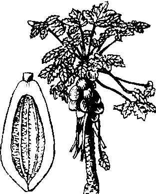 | 释义 | 番木瓜papaya番木瓜科番木瓜属,热带常绿果树, 小乔木。栽培种番木瓜, 又名木瓜、乳瓜、万寿果。学名Carica papaya L.。番木瓜属有40多个种。除栽培种外较重要的种质资源尚有: 茎花番木瓜caulifolia Jacq.) 耐寒性较强, 对花叶病有免 疫性, 其杂交后代也具有抗病能力, 可作番木瓜砧木;秘鲁番木瓜 (C. monoica Desf.), 播种后3~4个月开始结果, 全株可煮食, 以本种作母本的后代杂种优势常较显著; 山番木瓜 (C. candamorensis Hook.f.)果小可供糖渍、腌制,抗寒性较强并抗病毒性病害,与番木瓜嫁接亲和力强; 五棱番木瓜(C.pentagonaHeilb.), 有单性结实能力, 果小而富含番木瓜蛋白酶和抗坏血酸, 含糖量较低, 为佐餐佳果, 有助于减肥,澳大利亚已有生产;槲叶番木瓜(C.quercifolia Be-nth. et Hook.), 果小, 可加糖食用, 较耐寒并抗花叶病。