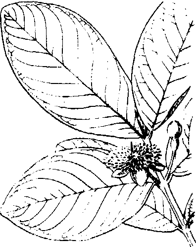 番石榴 番石榴桃金娘科番石榴属常绿乔木或小灌木。原产于美洲热带地区。16世纪传入菲律宾后引入中国。番石榴属约有100种,中国仅有1常见栽培种。树高可达5 m。叶对生,长椭圆形或长卵形,长7.5~15 cm,宽4.5~7.5 cm。花两性,单生或2~3朵聚生于叶腋。先端急尖,基部近圆。花单生或2~3组成聚伞花序。花瓣长1~1.4cm。浆果球形、卵形、梨形,长2.5~10 cm。中国栽培的番石榴花期4~5月,果熟期7~8月。8~9月有少量开花,可2次结果。中国华南、华东、西南各省区引种作果树栽培,果实味甜美。适应性强,许多地区归化,常见低山丘陵灌木林中。番石榴属150种,中国作果树引入2种,其中草莓番石榴,浆果梨形或球形,长2.5~4cm,熟时紫红色,果肉白色、黄色或胭脂红色。花果期6~9月。 |