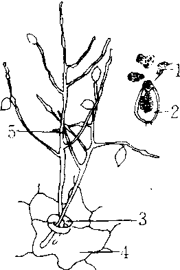 疫霉属 1. 游动孢子 2. 孢子囊 3. 气孔 4. 寄主细胞 5. 孢囊梗 |