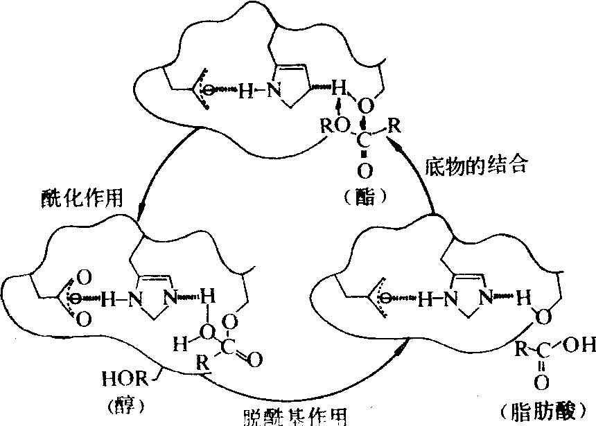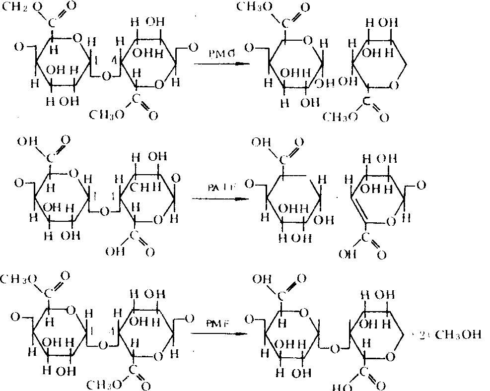 果胶酶 包括一组能对果胶分子中鼠李半乳糖醛酸链产生作用的酶类,通常分为两类: ❶果胶甲基酯酶(pectin methyleste rase), ❷果胶水解酶(pectichydrolases)和果胶裂解酶(pectic lyases)(图2)。作用是从果胶质中除去甲基基团以产生果胶酸。作用方式是在糖C6部位的羧基处水解每 一个α-1,4连接的半乳糖醛残基产生一个糖醛酸羧基和甲醇。