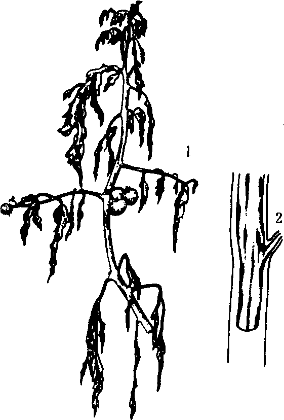 1. 青枯萎蔫症状; 2. 茎基剖面示维管束变褐色