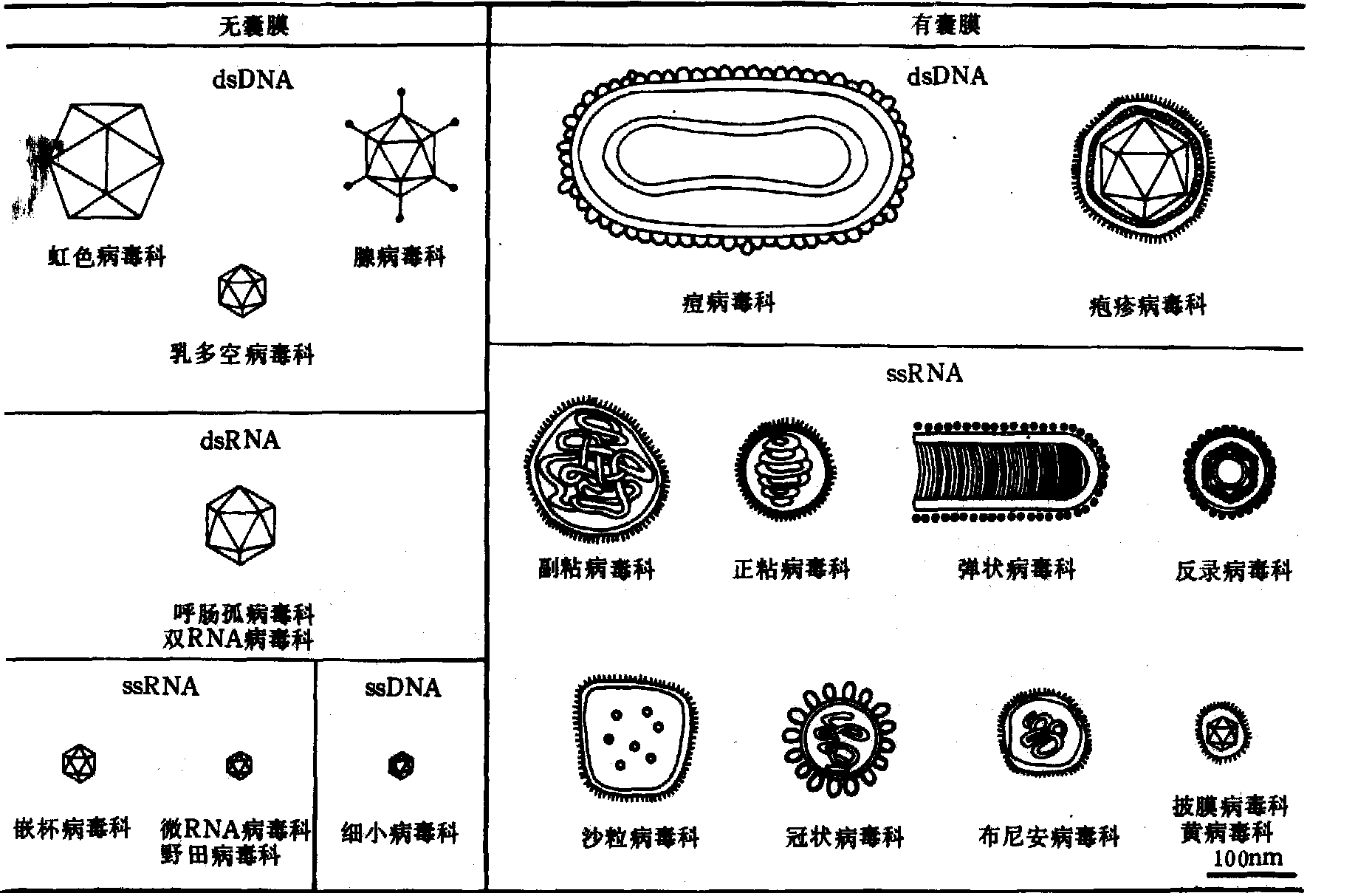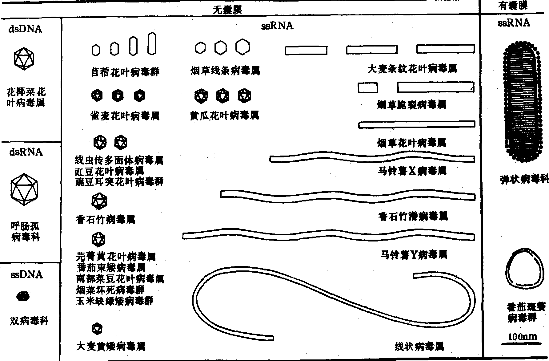 脊椎动物的病毒各科 在感染脊椎动物的病毒中得到病毒分类和命名委员会承认的有19个科,其中DNA病毒有6科,RNA病毒有13科(表1)。科以下设属,有些在科与属之间还设亚科。科、亚科和大部分属均有学名,少数属尚用俗名。近年来有些学者把部分未分类和新发现的病毒设立新科,如嗜肝病毒科和凸隆病毒科等。 节肢动物病毒各科 已知有11个科的病毒能感染节肢动物,主要为昆虫。其中9个科的某些属感染脊椎动物。不少成员既感染吸血节肢动物,又感染脊椎动物。在前者中呈隐性感染,侵入后者时表现临床症状,它们被称作虫媒病毒。只有2个科专门感染节肢动物,即杆状病毒科和野田病毒科,特别前者引起的病最多,危害最严重,如核型多角体病毒。病毒水平传递主要为经口感染,也有通过卵作垂直传递。多种病毒已用于昆虫的生物防治,如用核型多角体病毒防治棉铃虫效果良好。 植物病毒各科群 除了呼肠孤病毒和弹状病毒两科(大部分成员感染脊椎动物和节肢动物)外,专门感染植物的病毒共分23群(表2),在分类上还未建立“科”这一级,属的名称中一部分尚用俗名。在形态上,有11群呈20面体对称,7群呈螺旋状对称的杆状,剩余5群的结构尚未清楚。在这23群中只有1群具有囊膜。极大多数病毒的基因组为正股的线状单股RNA,只有个别群为其他核酸类型。植物病毒是仅次于真菌的重要植病病原,被感染植物表现变色、坏死和畸形等症状。 病毒Bing du一类没有细胞结构但具有生命现象的微小生物。个体微小,常以纳米为度量单位(1微米=103纳米),要借助于电子显微镜才能观察到。能通过细菌过滤器,故又称过滤性病毒。其结构完整并具侵染能力的病毒颗粒,称为病毒粒子;内只含单分子的脱氧核糖核酸或核酸,外覆盖有蛋白质外壳称衣壳;有些在壳外覆以脂蛋白膜称被膜,内含蛋白质、脂类、多糖等成分,膜上常有钉状突起。不能独立自行新陈代谢,只能在一定的活细胞中增殖,为严格的活细胞内寄生。有些在侵入寄主后,可刺激细胞内形成具有一定形态的蛋白质结晶体,内含1—数个病毒粒子,个体较大,可在光学显微镜下见到,这种小体称为包涵体,可在细胞质或细胞核中形成。在一些昆虫中此小体成多角形,在核内形成者称为核型多角体病毒,在细胞质中形成者称为质型多角体病毒,均内含多个病毒粒子;有些则形成圆筒形或椭圆形,内含一个病毒粒子,称为颗粒体病毒。病毒与人类关系十分密切,可引起人类疾病,如肝炎病毒、脊髓灰质炎病毒、流感病毒、人免疫缺陷病毒,分别引起人类肝炎、小儿麻痹、流行性感冒、艾滋病等,一些肿瘤病毒与人类肿瘤的关系已引人注目;还可引起动植物病害,如引起烟草花叶病、蕃茄斑萎病、牛瘟、猪瘟、狂犬病等;少数对人有利,已广泛应用于生物防治及分子生物学研究,例如棉铃虫多角体病毒用于防治棉铃虫,仙台病毒用于研究细胞融合等。 病毒微生物中的类群之一。详“生物学一般”中的“病毒”。