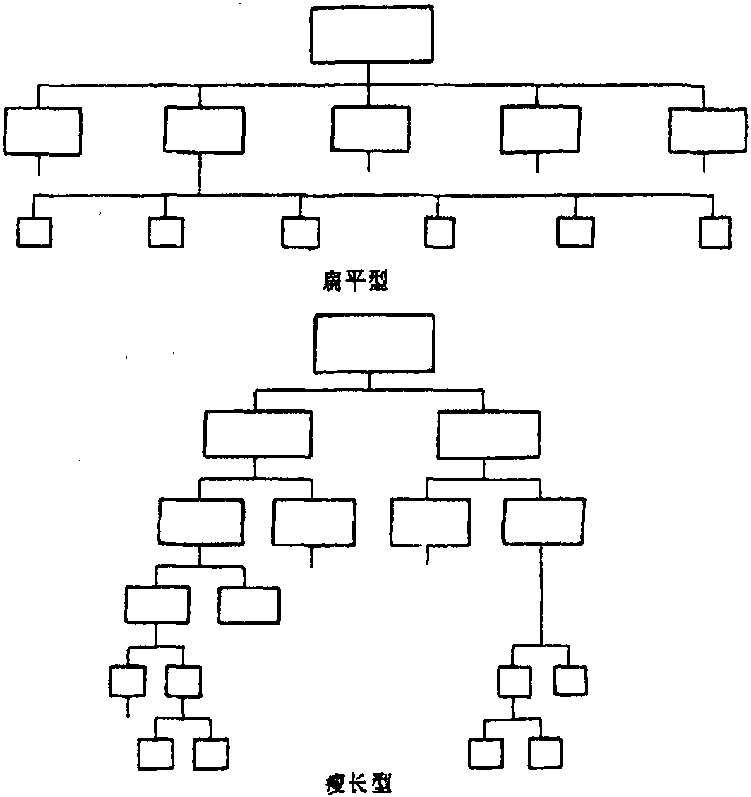 | 释义 | 瘦长型组织与扁平型组织采用“瘦长型”组织结构还是扁平型组织结构,主要决定于管理辖度的大小。一个瘦长型组织结构具有很多管理层次,而一个扁平型的组织结构只有较少的管理层次。当一个组织采用较小的管理辖度时,就会呈现出较多管理层次的瘦长型管理结构;相反,当一个组织选用较大的管理辖度时,管理结构就平坦得多。这两种组织结构如图12所示。实际上,对管理辖度大小的决策就是对管理层次结构的决策。