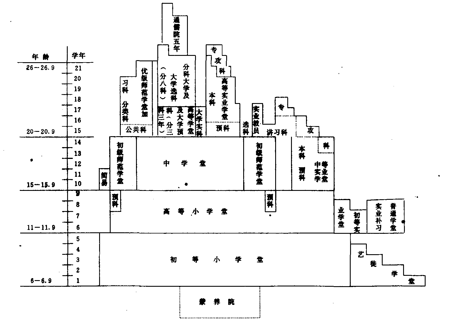 | 释义 | 021 癸卯学制中国近代第一个正式施行的学制。即1903年制定,1904年1月公布的《奏定学堂章程》。指导思想是:“中学为体,西学为用”。课程设置上中西兼学,但特别注重读经。教育年限为小学9年,中学5年,高等学堂及大学6至7年,通儒院5年。分普通学堂、师范学堂、实业学堂三个系统。另设译学馆、进士馆。实行到辛亥革命为止。 癸卯学制guimao xuezhi1902年,清政府公布了《钦定学堂章程》(即《壬寅学制》),但未见实行。1903年,张百熙、张之洞、荣庆又受命重新拟定了《奏定学堂章程》。清政府于1904年1月正式公布了这一章程,并令在全国施行。因公布之时正值癸卯年,故这一章程又称为《癸卯学制》。它包含着从小学到大学的完整体系。从纵的方面看,整个学制分三段六级:第一阶段为初等教育,设初等小学堂5年,高等小学堂4年,另设蒙养院;第二阶段为中等教育,设中学堂5年;第三阶段为高等教育,设高等学堂或大学预科3年,分科大学堂3~4年,通儒院5年。从横的方面看,与高等小学堂平行的,有实业补习学堂、初等农工商实业学堂和艺徒学堂;与中学堂平行的,有初级师范学堂,中等农工商实业学堂;与高等学堂平行的,有优级师范学堂,实业教员讲习所,高等农工商实业学堂。《癸卯学制》规定,儿童7岁入学,从入初等小学堂到通儒院毕业共需26年,是我国最长的一个学制在课程方面,《癸卯学制》规定,初等小学堂分完全科和简易科两类,均为5年。完全科的必修科目为修身、读经讲经、中国文学、算术、历史、地理、格致、体操八科,随地方情形而定的图画、手工一科或两科为随意科。简易科的科目为修身、读经、中国文学、史地格致、算术、体操五科。高等小学堂的学科为修身、读经讲经、中国文学、算术、中国历史、地理、格致、图画、体操九科,根据地方情形而加的手工、农业、商业等为随意科。中学堂的学科分十二种:修身、读经讲经、中国文学、外国语(东语、英语或德语、法语、俄语)、历史、地理、算学、博物、物理及化学、法制及理财、图画、体操。高等学堂的学科分三类:第类预备入经学、政法、文学、商科等入学,第二类预备入格致、工科,农科大学,第三类预备入医科大学,各科又根据各自的需要设立专习科目。大学堂设经学科、政法科、文学科,医科、格致科、农科、工科、商科等八科分科大学,它们的课程各自具有具体规定。另外,《癸卯学制》对于师范教育系统和实业教育系统的课程设置也分别作了非常具体明确的规定。《癸卯学制》从公布起一直施行到1911年清朝灭亡,是中国教育史上最早颁布并在全国施行的具有资本主义色彩的新学制。虽然它具有浓厚的封建性、等级性和买办性,但它改变了中国长期以来形成的封建式的官学、私学、书院等学校形式,为中国现代形式的学校制度的建立奠定了基础,在中国教育制度发展史上占有一定的地位。 癸卯学制guimao xuezhi清末颁定的第二个学校系统,是中国正式实行了的第一个近代学制,颁定于1904年1月(光绪二十九年十一月),正是癸卯年,故称癸卯学制,也叫奏定学堂章程。是在前一年的钦定学堂章程的基础上,由张百熙、荣庆、张之洞重订的,包括《学务纲要》、《大学堂章程》(附《通儒院章程》)、《高等学堂章程》、《中学堂章程》、《高等小学堂章程》、《初等小学堂章程》、《蒙养院章程及家庭教育法章程》、《优级师范学堂章程》、《初级师范学堂章程》、《实业教员讲习所章程》、《高等农工商实业学堂章程》、《中等农工商实业学堂章程》、《初等农工商实业学堂章程》(《附实业补习普通学堂及艺徒学堂各章程》)、《译学馆章程》、《进仕馆章程》、《各学堂奖励章程》、《各学堂管理通则》、《任用教员章程》等。普通教育分成3段7级:初等教育3级,包括:蒙养院;初等小学堂,5年;高等小学堂,4年。中等教育阶段1级,5年。高等教育阶段,3级:高等学堂(大学预科),3年;分科大学堂,3~4年;通儒院,5年;共11~12年。普通教育若不计蒙养院年限,尚需25~26年。此外还有实业学堂、师范学堂、进仕馆、译学馆等。与高等小学堂平行的有实业补习普通学堂、初等农工商实业学堂、艺徒学堂;与中等学堂平行的有初级师范学堂、中等农工商实业学堂;与高等学校平行的有优级师范学堂、实业教员讲习所、高等农工商实业学堂、进仕馆、译学馆等。这个学制实施到辛亥革命后南京临时政府成立。学制中规定的蒙养院制度,是我国最早的学前社会教育机构。 癸卯学制Guimao xuezhi中国近代颁布的关于学制的系统文件,亦是中国废除科举制度后第一个正式颁布施行的新式学制。1904年1月,清政府公布由张百熙、荣禄、张之洞参照日本学制拟订的《奏定学堂章程》。是年为旧历癸卯年,故称之为癸卯学制。该学制的指导思想是“中学为体,西学为用”。规定学堂的立学宗旨是“以忠孝为本,以中国经史文学为基,俾学生心术壹归于纯正,而后以西学论其知识,练其艺能,务期他日成才,各适实用”。该学制制定了各级各类学堂的章程,及学堂管理、教员任用等章程。包括:《大学堂章程》(附通儒院章程)、《高等学堂章程》、《中学堂章程》、《高等小学堂章程》、《初等小学堂章程》、《蒙养院及家庭教育法》、《优级师范学堂章程》、《初级师范学堂章程》、《高等农工商实业学堂章