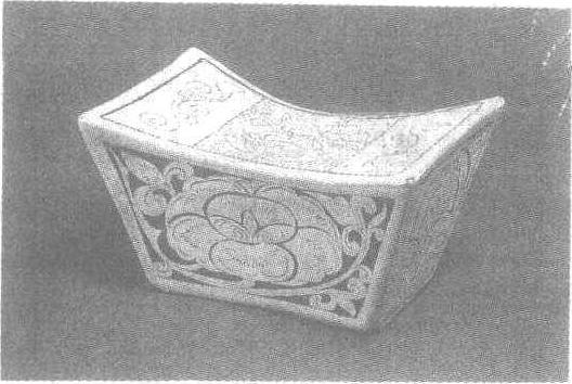 | 释义 | 登封窑刻剔花牡丹纹瓷枕北宋。高10.7厘米,面径长14.3厘米。上海博物馆藏。登封窑位于河南省登封县,始烧于唐而盛于宋。除珍珠地划花外,刻花、剔花也是登封窑装饰的常用手法。此枕四面呈倒梯形,枕面两头上翘,形似银锭。制作时在瓷胎上施一层厚厚的白色化妆土,再用刻花和剔花方法制作花卉图案。刻花是在化妆土上直接刻画,露出的赭红色胎形成漂亮的图样。剔花是用刀剔去花纹以外的花妆土,露出胎色衬托着乳白色的花朵。两种装饰手法不同,效果迥异。前者花纹纤细、流畅;后者粗犷、豪放。此件瓷枕的各面装饰是两种手法并用,两种风格并存,使此器益显其绚丽多姿,也体现了制作者的创新。