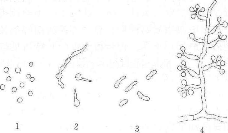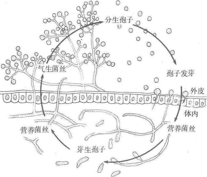白僵菌分生孢子在室外日光照不到的地方或土中,约可生存5个月至1年; 10℃以下低温中,能生存3年;-20℃的低温中可达4年之久。直射日光(32~33℃)下,5小时可使其失去致病力。对消毒药剂的抵抗力,与曲霉菌相比要弱得多,1~3%甲醛溶液浸渍10分钟、0.2%有效氯漂白粉溶液浸渍5分钟、0.1%升汞溶液浸渍2分钟、70%酒精浸渍1分钟均能使其灭活。 传染 白僵病的传染途径主要是经体壁接触传染,其次是创伤传染。覆盖于白僵病蚕尸体上的分生孢子,极易脱落,且质轻量多,随风飞散。当孢子带进蚕座并附着于蚕的体壁后,在适宜的温湿度条件下,约经6~8小时即开始发芽,孢子膨大,然后长出1~2根发芽管。发芽管能分泌蛋白分解酶、脂肪分解酶和几丁质分解酶。通过3种酶的共同作用将寄生处体壁分解,然后再借助发芽管伸长、生长的机械压力穿过体壁,侵入体内寄生(图2)。 白僵菌分生孢子发芽、发育的适温为24~28℃,5℃以下或33℃以上都不能发芽、发育。在适宜的温度下,白僵菌的发芽必须在相对湿度75%以上。湿度愈高,发芽率愈高。养蚕生产中,蚕座内的温湿度十分适合白僵菌的发芽发育。 白僵菌分生孢子被蚕食下,因分生孢子在蚕的消化液内不能发芽,随粪排出体外,不会使蚕致病。