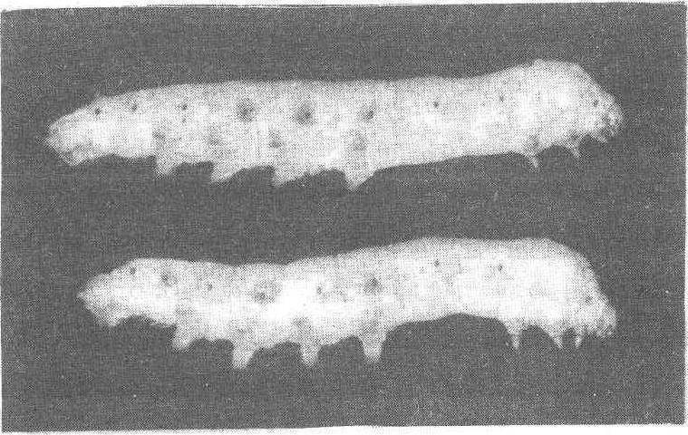 图 3 白僵病蚕症状 病蚕尸体由于寄生菌的发育而逐渐硬化,经1~2日后,长出菌丝和分生孢子,如继续自然放置一定时间,会从体内析出很多针状结晶物。 诊断及防治 诊断白僵病,除根据僵病蚕共同特征外,由于白僵病蚕出现油渍状病斑,镜检血液能看到卵圆形的短菌丝,死后尸体不呈现淡红色,也不形成菌丝束,可以根据这些特征与其他僵病蚕相区别,作出初步诊断。进一步可再将病蚕进行体表消毒(1%有效氯漂白粉溶液浸1分钟),分离出病原菌,最后鉴定是否属于白僵病菌。 白僵病的防治主要做好养蚕前的蚕室蚕具消毒和蚕期中的蚕体蚕座消毒。蚕室蚕具消毒是为了杀灭残存在蚕室蚕具上的病原菌分生孢子。用甲醛类消毒剂、优氯净消毒剂、漂白粉消毒剂及古老的硫磺熏烟法等,都能有效地杀灭白僵菌孢子。蚕体蚕座消毒是为了杀灭已带进蚕座甚至已附着在蚕体上的白僵菌分生孢子。1970年前,普遍使用赛力散和西力生等有机汞剂防僵粉,以后陆续试验推广了灭菌丹、克菌丹、百菌清、防病1号,防僵灵2号和优氯净等新的防僵药剂,以代替有机汞剂。这些药物,只要按使用方法严格使用,对本病防治均有良好的作用。使用防僵药剂时,一般在蚁蚕及各龄饷食前使用一次即可,但有本病发生时,最好每日使用一次,撒粉量以见蚕座上如落霜状为度。撒粉后,约经10分钟,加网给桑。使用熏烟法也是一种简便易行的防僵措施,如应用松针熏烟。在蚕期中还经常用干草、谷壳和锯屑等含纤维量多的材料熏烟。此外,为防治白僵病的发生,还要注意驱除桑园害虫,及时拣除病蚕和勤用干燥材料,在蚕区禁止使用白僵菌作生物防治剂。 白僵病一种由白僵菌引起的常见病类。白僵菌分生孢子遗落蚕体在合适的温湿度条件下发芽,分泌溶体壁酶类入侵蚕体到达血液,通过营养“菌丝一短菌丝一营养菌丝”的循环增殖,以分泌白僵菌素对血液阳离子的络合作用,引起蚕体生理障害,夺取养分而致死蚕儿。病蚕表现:体色稍暗、呆滞,体壁上出现淡褐色针尖大小散在病斑,有时在气门处出现1—2个圆形大病斑,继而排软粪,稍吐液死亡。初死,头部伸出,尸体极度软化,从尾部出现桃红色后硬化,菌丝体突出体表,整个尸体覆盖一层白粉状分生孢子。白僵菌对昆虫的寄宿域广,更由于白僵菌作为生物制剂广泛用于农林害虫防治,因而此病的防治增添了困难。多湿是发病的重要诱因,生产上春蚕多发此病。显微镜镜检病蚕血液,以产生圆筒状短菌丝作为早期诊断依据。 |