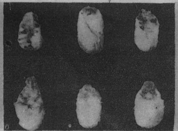 图1 蜂球囊菌 蜂球囊菌与花粉球囊菌(Bettsia alvei Csou,1972)极为相似,后者又称花粉霉菌,它的球形孢子不聚集成孢子球,一般在18℃下生长。 蜂球囊菌在马铃薯-葡萄糖琼脂和加入0.4%酵母浸出液培养基或在麦芽琼脂培养基(0.5~2%麦芽)上生长良好。有人发现,蜂球囊菌需要复合氮源,在加入0.1%天门冬氨胺和0.5%酵母浸出液培养基上,pH值近于中性或低于7.2时生长良好,其生长最适合温度为30℃。 症状 白垩病通常发现在幼虫脾外缘,主要使老龄幼虫或封盖幼虫死亡。约4日龄雄蜂幼虫最易感染。死亡幼虫最初呈苍白色,以后变成灰色至黑色。幼虫尸体干枯后成为质地疏松的白垩状物。蜂蛹除头部外,几乎都被蜂球囊菌所包裹。(图2)