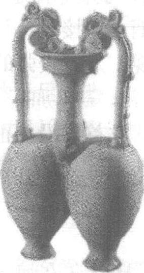 | 释义 | 白瓷双腹瓶隋代制品,现藏天津市艺术博物馆。此瓶高18.5厘米,口径5.2厘米,白釉泛黄,有小开片。双腹单口,口形如盘,双腹的肩上各伸出一只螭形柄,螭首衔口沿,做饮水状,颈腹交接处有环形耳,可供扎系。颈、腹饰弦纹数道,以简洁的手法使光素的颈腹产生变化。在西安李静训墓中,曾出土与之相仿的器物,可见这种造型奇特、空间变化较多的双腹瓶曾风行一时。