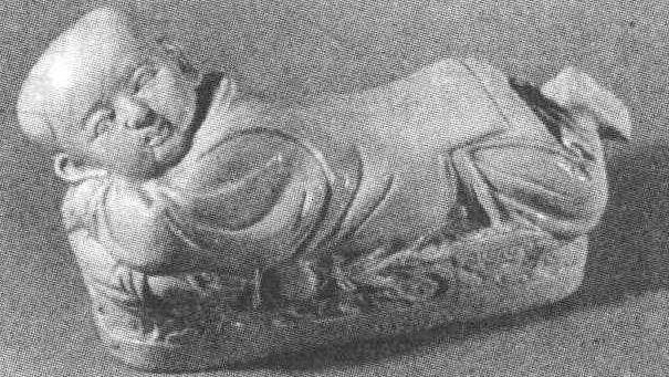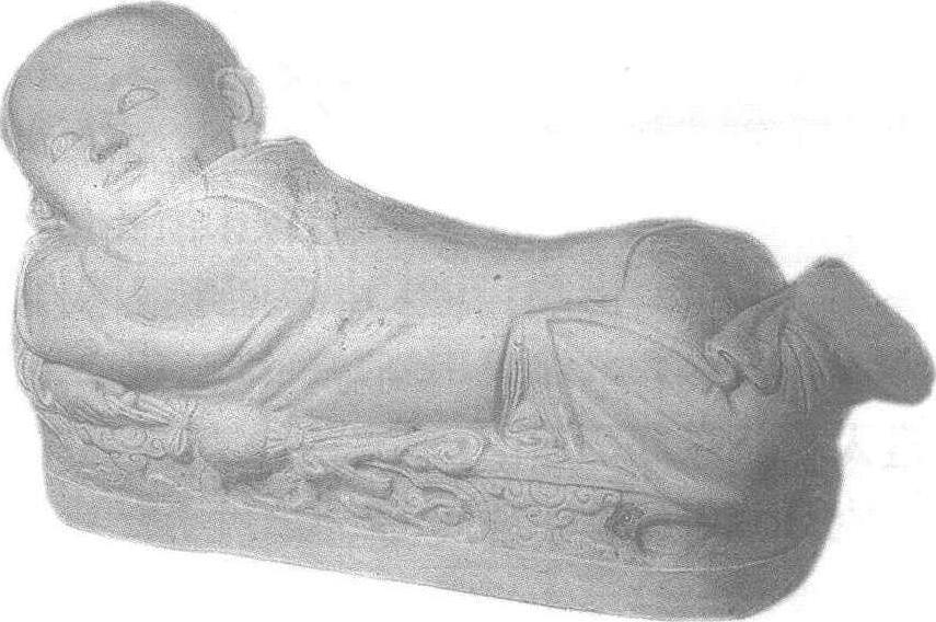 定窑宋白瓷孩儿枕 白瓷孩儿枕北宋定窑制品,现为北京故宫博物院珍藏。枕高18.3厘米,长30厘米,宽11.8厘米。造型为一俯卧的儿童,双臂抱拢,枕于头下,侧首上仰,双足拱起。以儿童俯卧形成的弯曲下凹的背部为枕面,构思巧妙,既可作实用品,又是一件完美的雕刻艺术品。儿童形象刻画细腻传神,脸部饱满,宽额大耳,眉毛高挑,双目圆睁,鼻子小巧挺直,小嘴鼓凸,把稚气未脱的童子形象表现得淋漓尽致,惹人爱怜。在头顶两侧各扎一髻,为我国古代儿童常见的“勃角儿”发式。儿童左手垫头,右手拿绣球,上缀丝绦蝴蝶结。身穿长袍,外罩背心,下穿肥裤,足着软靴。衣纹处理简洁流畅,疏密得体,很好地表现出衣物的质感,绣球及袍服上的花纹清晰可见。