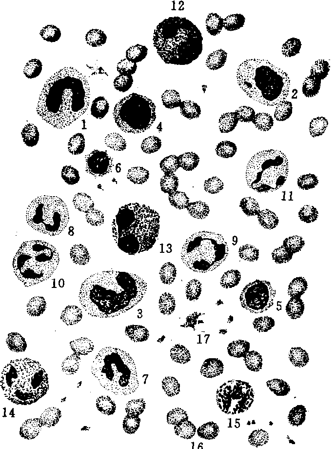 | 释义 | 白细胞及其分类白细胞是无色有核的细胞,体积比红细胞大,每立方毫米血液中有4000—10000个。观察白细胞的形态和特点需用涂片复合染色的方法,在血涂片(见图1.4-2)上白细胞可分为两大类:一类细胞的胞质内含特殊颗粒,称为粒细胞,其中又因颗粒着色性质不同分为嗜中性、嗜酸和嗜碱粒细胞三种,它们都是在红骨髓中生成的;另一类细胞的细胞质不含特殊颗粒,包括淋巴细胞和单核细胞,前者在淋巴组织中生成,后者在红骨髓中生成。