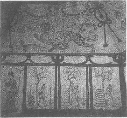 | 释义 | 白虎与人物图壁画唐。纵255厘米,横225厘米。山西省太原市金胜村7号墓墓顶和墓室西壁壁画。1987年发掘。墓室顶部和四壁共有14平方米壁画,内容以星象、四神和树下人物为主,此为其中的一部分。上部为白虎,呈疾走状,口大张,面目凶恶。下部红色绘出的界格内画人物,左侧为一女性,梳高髻,上罩半臂,下系花长裙,形象丰满,额上还有流行的花钿。其余三幅均绘立于树下的老翁,神情各异,为沉思状、指物状、恸哭状。画面可能表现的是某一故事情节。据推测,绘画时代应在武周时期。