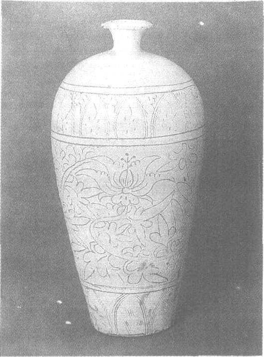 | 释义 | 白釉划花瓷梅瓶辽。高38.5厘米,口径4厘米。山西省大同市博物馆藏。此瓶小口,丰肩,腹部下收,平底,造型丰满,给人以敦实、稳重之感。器身以双弦纹相隔构成三层划花纹饰。肩部作莲瓣纹装饰,莲瓣间的空隙处以小草相填。腹部布满缠枝花卉,胫部亦以莲瓣为饰。划花线条较细,虽不甚规整,但可看出划花手法娴熟、自由,不受拘泥,不含匠气,朴实而亲切。因胎色露出微红,故露胎的花纹和洁白的胎釉相映成趣,既醒目又柔和。