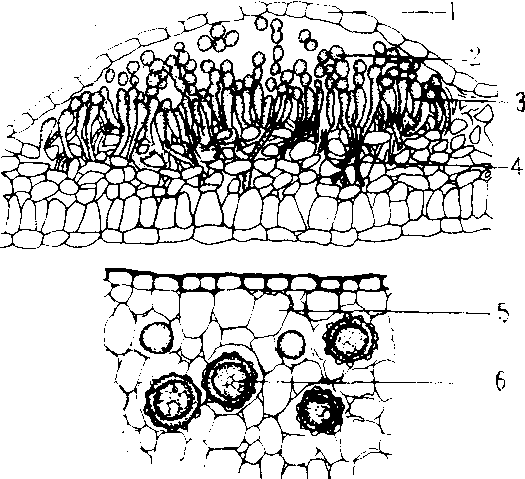 白锈属 1.寄主表皮细胞 2. 孢子囊 3. 孢囊梗4. 胞间菌丝 5. 寄主组织 6. 卵孢子 |