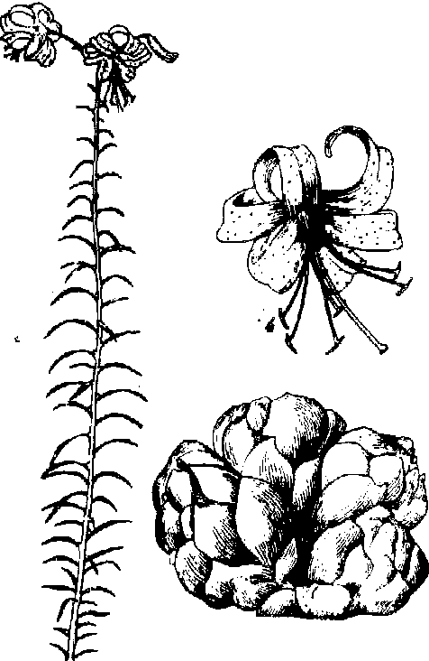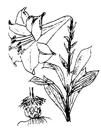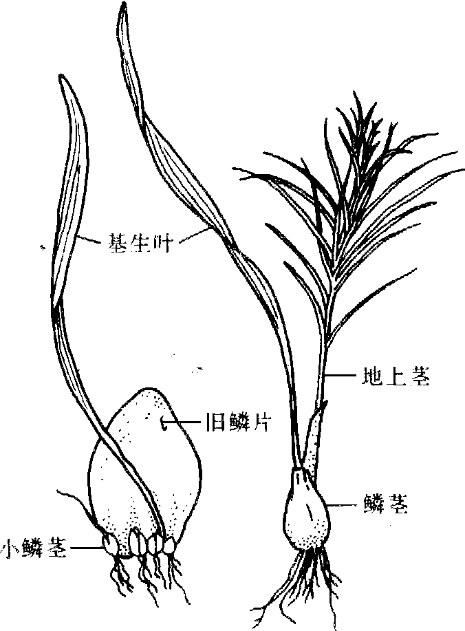 图 2 百合鳞片形成小鳞茎示意图 贮藏加工 百合一般在11月初采收。掘出鳞茎及时除茎秆、泥土、剪须根,置室内分级贮藏。层积贮藏法于地面铺5~8厘米厚湿土,鳞茎排列土上,其上覆土3~4厘米,土上再排放鳞茎,如此堆叠,高达1米,于四周及顶部盖土20~30厘米。贮藏期须保持低温和定期检查,一般可贮藏至翌年3月,若在0℃冷库可存放更长时间。硅窗塑料帐气调贮藏效果更好。干百合可久存远运。百合干制品的加工方法是:剥离鳞片,洗净后入沸水“烫漂”5分钟,转冷水中冷却,置竹帘曝晒或在60℃烘干室经15~16小时干燥,干燥后在室内堆放2~3日回软后包装。100公斤鲜百合可制30~40公斤百合干。 病虫害及防治 百合主要病害是软腐病(见大白菜);主要虫害有蛴螬(Holotrichia diomphalia),为东北大黑鳃金龟的幼虫。 百合Baihe百合科。多年生草本,具鳞茎;鳞茎球形,直径约5厘米,鳞叶肉质,白色,无膜质鳞片。叶散生,倒披针形,具3—5条脉。花1—4朵,喇叭形,有香气;花被片6,倒卵形,白色,背面带紫褐色,无斑点;雄蕊6,花药丁字形着生;花柱1条,柱头3裂。蒴果长圆形,具多种子。分布于我国东南、西南、河南、陕西、甘肃。生山坡石缝中。鲜花含芳香油,可作食品、香料;鳞茎可食或入药,亦可栽培供观赏。
