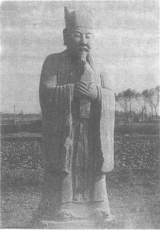 明。高330厘米。安徽省凤阳县明皇陵神道的石像生。青白石雕制。文官头戴七梁冠,身着一品官服,双手执笏于胸前,端立于台座上。其狭长的脸庞上,剑眉高挑,须髯垂胸,嘴角略下撇,一副老诚持重的样子。皇陵见“皇陵石虎”条目。