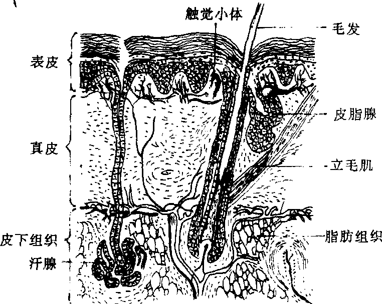 | 释义 | 皮肤的解剖pifu de jiepou覆盖在人体表面、直接与外界接触的一层组织称为皮肤。皮肤柔韧而富有弹性,面积随人体的大小而有所不同,成人约1.5~2.0平方米。皮肤的颜色主要与皮肤里面所含黑色素多少和血流的快慢有关。晒太阳以后,皮肤的黑色素增多,皮肤会暂时变黑;跑步以后皮肤发红,是因为毛细血管扩张、血流加快的缘故。皮肤的表面有无数高起的皮嵴和陷下的沟纹,尤其是手掌和足底的皮嵴和沟纹比较粗大,看上去更清楚。在手指的掌面,皮嵴还组成各式各样的花纹,叫指纹。每个人的指纹不一样,而且是不会改变的。皮肤是由表皮、真皮和皮下组织三部分组成 (见图)。表皮在外,是上皮组织,差不多像普通印书纸那样厚,最厚的地方不超过0.2毫米,共有10多层细胞。新生的细胞不断从深部向表浅生长,逐渐完成角质化过程,形成真皮最上层的角质层,角化的细胞不断从表面脱落,形成皮屑。表皮内无血管,细胞之间的空隙,就是运送营养和排泄废物的通道。最底下一层细胞有的可以制造黑色素。冬季干燥,角质层水分减少,可使皮肤粗糙、干裂。真皮在表皮下面,较厚,由结缔组织构成、富有弹性,与表面的分界明显。真皮内有血管、神经、淋巴管、汗腺、皮脂腺和毛发等皮肤附属器官。真皮下面是皮下组织,由脂肪组织组成,也称为皮下脂肪。皮下组织也有血管,淋巴管和神经通过。
