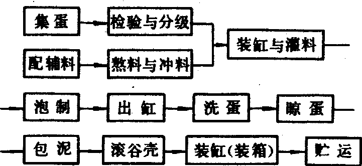 | 释义 | 皮蛋加工lime preserved egg processing采用以碱性物质为主的辅料,涂敷在新鲜禽蛋的外壳上,腌制一定时间得到成熟制品的加工过程。皮蛋又名松花蛋,蛋白是茶色胶冻状,其中常有松针状结晶,蛋黄可明显分为墨绿、草绿、暗绿、茶色、橙红五种彩色层,风味清香爽口。皮蛋营养丰富,氨基酸的含量为鲜鸭蛋的11倍,还具有清凉解热、降低血压等医疗作用。皮蛋加工多采用鸭蛋,有浸泡、包泥和浸泡包泥三种加工方法,各种加工方法的基本原理一致。浸泡包泥法的工艺流程是: