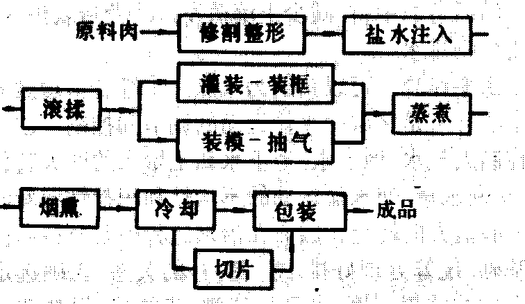 | 释义 | 盐水火腿加工salt water ham processing以畜禽肉为原料,剔骨、选料、精选、切块、盐水注入(或盐水浸渍)腌制后,再经滚揉、充填(不充填)、蒸煮、烟熏(或不烟熏)、冷却制成的熟肉制品过程。盐水火腿在中国习惯上又称西式火腿。产品原料选择严格,以腿、背腰瘦肉为主。根据选料和工艺要求不同,盐水火腿可分为两类:熏煮火腿类,按形状有方火腿、圆火腿;按原料分为猪肉火腿、牛肉火腿、鹅肉火腿、火鸡火腿等。压缩火腿类,以小块畜禽肉为原料,加入经乳化后的兔肉、鱼肉作芡肉混合加工制成,可少量(≤5%)添加淀粉,属大众化火腿类制品,日本JAS将此类制品分为特级、上级和标准级三种。火腿制品门类中还有发酵火腿类,将带骨、带皮(或去骨、去皮)的猪腿肉,经腌制、处理和长期发酵、成熟而成的生肉制品。