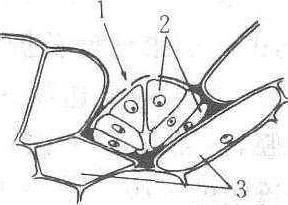 柽柳属叶上的盐腺 1.孔 2. 分泌细胞 3.收集细胞 |