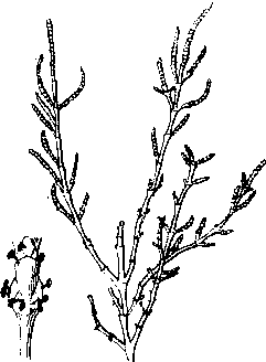 盐角草 盐角草一年生草本,高10—40厘米。,植株通常红色。茎直立,枝对生。叶鳞片状。穗状花序,有短柄,花腋生。花果期7—9月。产布尔津、阿勒泰、乌鲁木齐、昌吉、塔城、精河、博乐、伽师、哈密、巴里坤、莎车等地。抗干旱、耐盐碱植物。 |