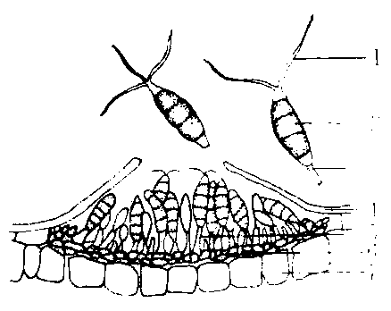 盘多毛孢属 1. 丝状附属物 2. 分生孢子 3. 短柄 4. 寄主角质层 5. 分生孢子梗 6. 分生孢子盘 7. 寄主细胞 |
