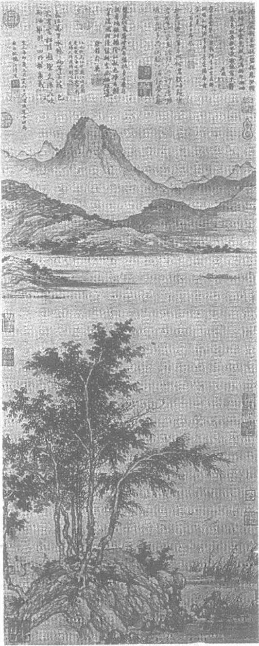 | 释义 | 盛懋秋江待渡图轴元。盛懋绘。纸本墨笔。纵112.5厘米,横46.3厘米。北京故宫博物院藏。盛懋,字子昭,临安(今杭州)人,住嘉兴魏塘镇,与吴镇比邻而居。生卒年代不详。善画人物、山水、花鸟。初学陈琳,后变其法,是一位颇有影响的职业画家。笔墨技巧娴熟,但缺乏文人画家气质。画史称其“精致有余,特过于巧”。此图描绘江滨的山光水色。近岸土丘之上林木幽森,一位长者带着童仆坐于树荫之下,望水待渡。岸边风吹芦荻,惊起几只鸥雁,江水平阔宽渺,一只渡船载着数名客人缓缓驶来。对岸坡峦起伏,峰岭绵延,茂树稀落,水雾微茫。此图笔触灵变,近处高树描绘工整,而远山树丛则以横笔点染而成。山形柔和,皴线松动。墨色浓淡映衬,并结合部分晕染。意境清旷,画风接近董源而有所变化。图中作者自题:“至正辛卯岁三月十又六日,武塘盛懋子昭为西白作秋江待渡。”至正辛卯为公元1351年。图中还有老甫、莹玉庵等六家题记,此图曾经清人耿昭忠、笪重光及清内府收藏,《古缘萃录》著录。