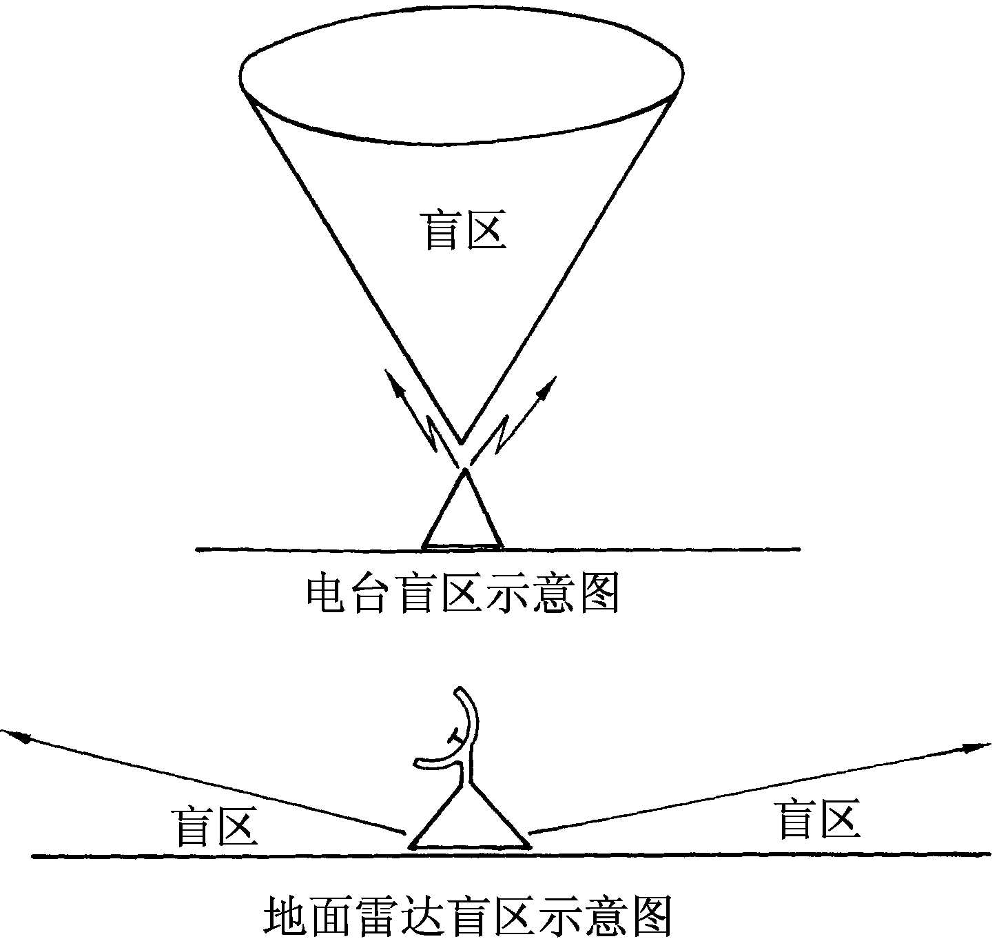航空器在实施无线电航行时,其机载无线电导航系统的接收机接收不到地面电台的无线电信号或雷达回波的空间。通常导航台、全向信标台的盲区在电台上方的啦叭形空间内;而地面雷达的盲区为有效距离的低仰角范围内,如上图所示。