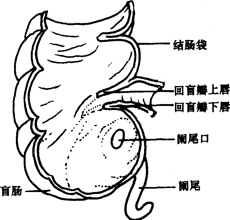 | 释义 | 盲肠mangchang是大肠的起始部,呈囊袋状,位于右髂窝内,与回肠相接。回肠通向盲肠入口处的粘膜突向肠腔内,形成上、下两片唇形的回盲瓣,有防止大肠内容物逆流入小肠的作用(图492)。
