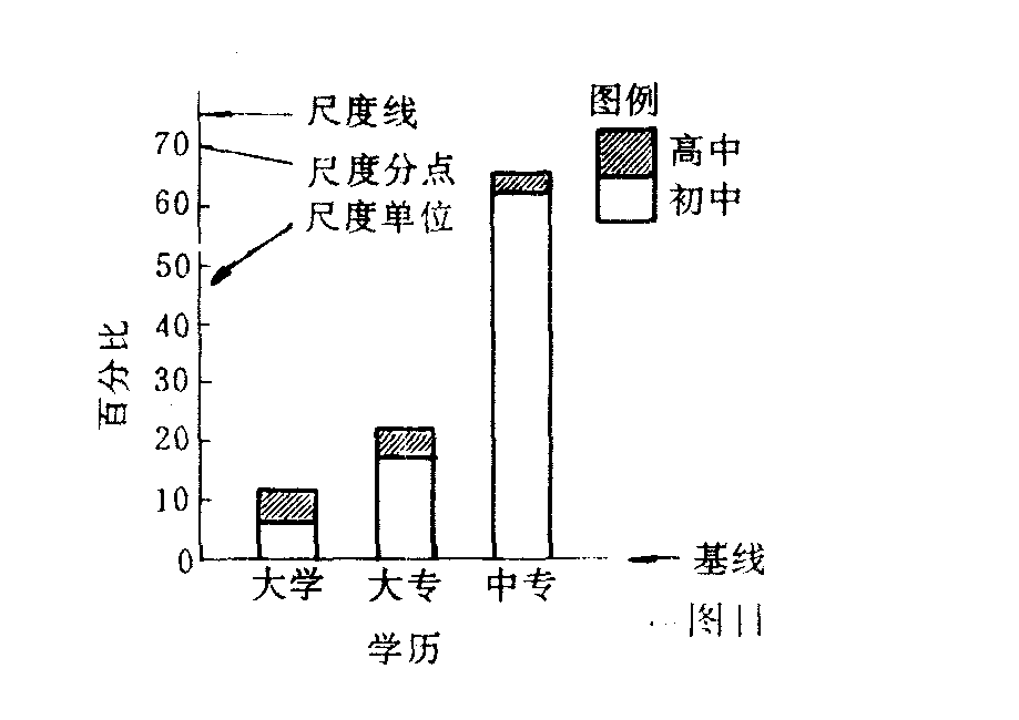 1983年我国普通中学教师来源 注:资料来源同“统计表”条表1。 直条图在平面直角坐标系中用等宽直条的高度来表示统计数量大小的统计图。常被应用于测验分数统计中。 |