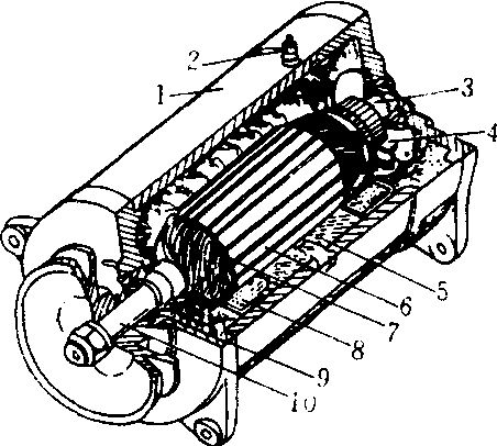 直流发电机构造 1. 外壳 2.接线柱 3.整流子 4. 炭刷 5.磁极铁芯 6.电枢 7. 电枢线圈 8. 激磁线圈 9.軸承 10.电枢轴 |