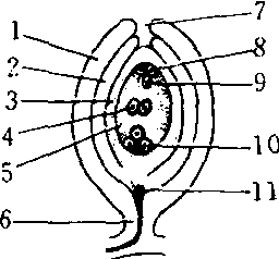 直生胚珠 1.外珠被 2.内珠被 3. 珠心 4. 极核 5. 胚囊 6.珠柄 7.珠孔 8.助细胞 9.卵细胞 10.反足细胞 11.合点 |