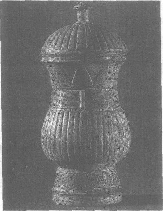 | 释义 | 直纹铜觯商。古代饮酒器。通高18.7厘米,口径8.4厘米。1969年河南省安阳市殷墟西北出土。北京中国社会科学院考古研究所安阳工作队藏。此觯身呈椭圆,侈口,束腰,腹膨出,高圈足,半球形盖,盖钮如爵柱。钮帽上饰涡纹,盖面饰直纹,口沿下饰蕉叶纹,颈饰夔纹带,腹部饰直纹,圈足饰云雷纹。此觯通体以直纹为主,不多见。同墓出土一对,形制、纹饰均相同。