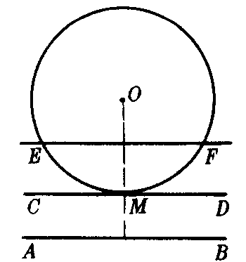 见图:❶直线和圆没有公共点,叫做直线和圆相离,如图中的直线AB;❷直线和圆有唯一公共点,叫做直线和圆相切,如图中的直线CD.这条直线叫做圆的切线,唯一的公共点叫做切点,如点M;❸直线和圆有两个公共点,叫做直线和圆相交.这条直线叫做圆的割线,如图中的直线EF.设圆的半径为R,圆心O到直线l的距离为d.则❶直线l和⊙O相离⇐⇒d>R;❷直线l和⊙O相切⇐⇒d=R;❸直线l和⊙O相交⇐⇒d
