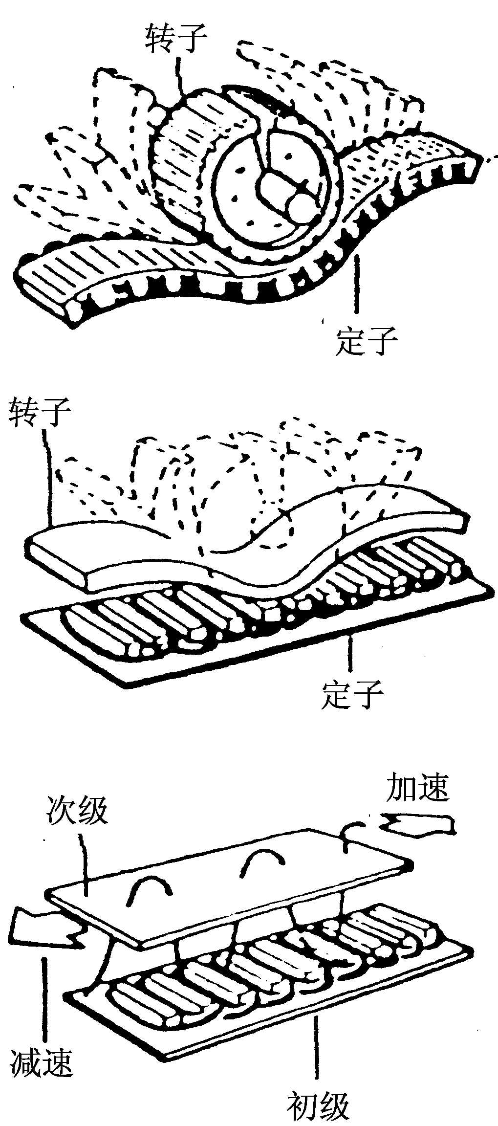 | 释义 | 直线电动机将电能直接转换成直线机械运动的电动机。结构原理上相当于将电动机沿电枢轴线剖开展成一个平面而作直线运动。在旋转电动机原理基础上结合直线运动特点发展起来的。属于异步电动机,转子作近似直线运动。 直线电动机linear motor又称“线性电动机”。驱动轨道交通车辆的一种新一代电动机。其工作原理与传统的旋转电动机相同,只是在结构上相当于将定子与转子剖开而展平(见下图),初级绕组与次级绕组分别安装在车辆与导轨上,利用所产生的移动磁场推动车辆作直线运动。按工作原理分有不同种类:直线异步电动机的初级绕组安装在车辆上,通以交流电后产生磁场,次级绕组是导轨上的感应板,工作原理与异步电动机相同;直线同步电动机的初级绕组连续安装在导轨上,次级绕组安装在车辆上,车辆以移动磁场的同步速度运动,工作原理与同步电动机相同。按结构分有:单边直线电动机,其初级绕组只与导轨的一侧产生感应作用;双边直线电动机,其初级绕组则与导轨的两侧都产生感应作用。
