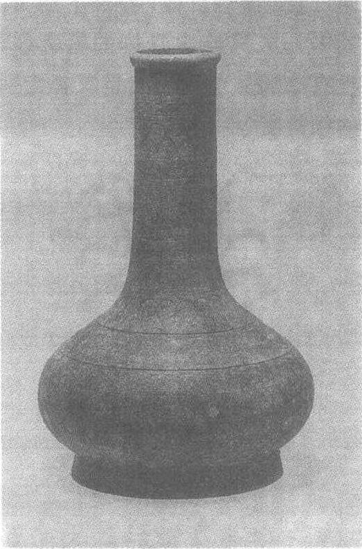 汉。盛酒器。通高29.3厘米。1982年云南省曲靖八塔台古墓出土。云南省博物馆藏。此壶扁圆腹,筒状长颈,唇口凸起,圈足。颈自上而下饰多层次的花纹,每层花纹均以宽弦纹为界。腹部饰菱形回纹。圈足底有一“×”符号。