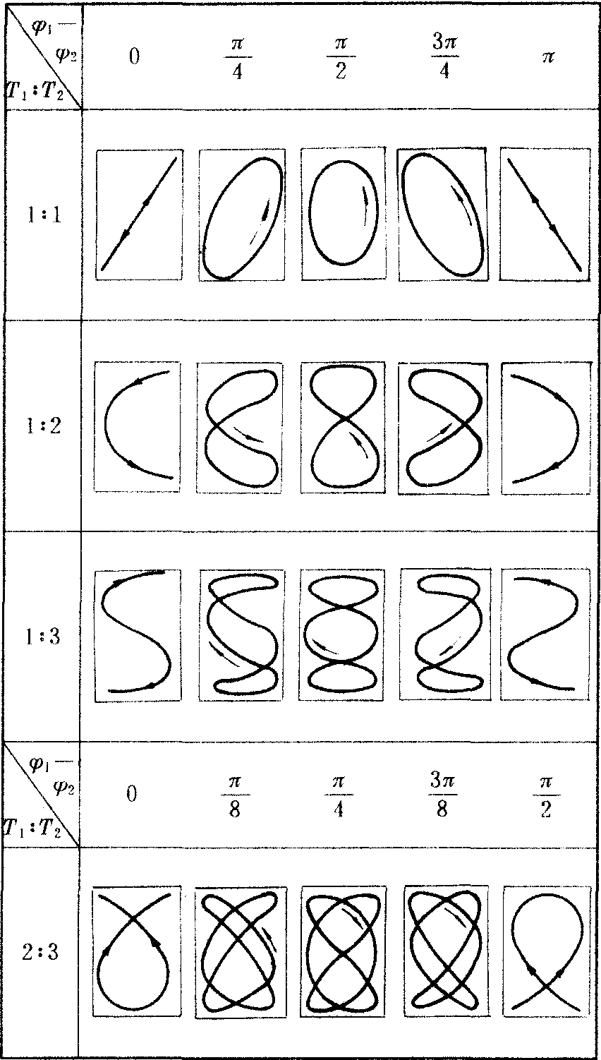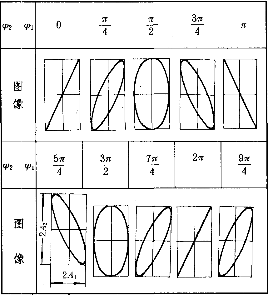注:表中各矩形两边长分别表示两分振动的二倍振幅。椭圆轨道逆时针方向运动。显然,当A1=A2=A,ᵠ2-ᵠ1=±π/2,合振动的轨迹是一半径为A的圆。当ᵠ2-ᵠ1取其他值时,合振动的轨迹将是形状与方向各不相同的椭圆。质点运动方向则为顺时针或逆时针。下表给出了几种特殊情况的合振动轨迹。 ❷相互垂直的不同频率的两谐振动的合成:振动方向相互垂直的不同频率的两简谐振动合成后运动比较复杂,一般轨迹是不稳定的。常研究以下两种特殊情况。当两分振动频率相差很小,则可近似地把两分振动看成同频率振动的合成,但两振动的位相差缓慢地变化。质点运动的轨道将要不断地按下表所示的次序,依次地从直线变成椭圆再变成直线,循环地改变下去。 当两分振动的频率成简单的整数比时,合成运动的轨道是稳定的、有规则的一些闭封曲线。运动具有周期性。这种相互垂直的频率成简单整数比的两简谐振动合成后的稳定的轨迹图形称为李萨如图形。曲线的形状决定于两分振动的振幅比、频率比和初位相差。利用李萨如图形的特点,可以由一个已知频率的振动求得另一个振动的频率以及它们之间的相差。在数字频率计没有被广泛采用之前,这是测量电信号频率的较简便方法。