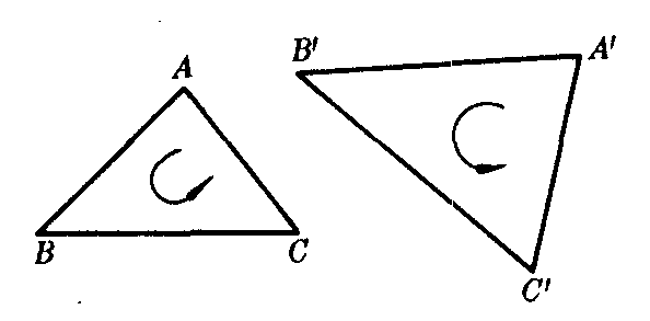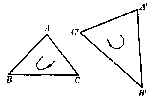 图2 若某相似变换把平面上的三角形变为与它同向的三角形,则称这个相似变换为正向相似变换(图1),反之称为反向相似变换(图2). 当k=1时,相似变换为合同变换,所以合同变换可以看作相似变换的特殊情况. |