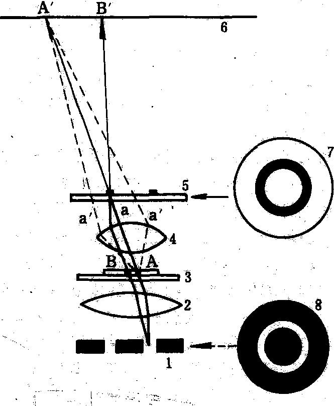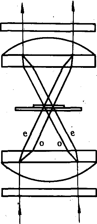图 1 相差显微镜原理 1. 环状光阑位置; 2. 聚光镜;3. 样品; 4. 物镜;5. 相板位置; 6. 实像平面; 7. 相板; 8. 环状光阑;A.B.细节; A′B′细节A的放大实像 结构 基本构造与普通光学显微镜相似,其特点是配备有环状光阑、相板及合轴调节用的中心望远镜。 环状光阑 具有环形开孔的光阑,位于聚光镜的前焦平面上,其直径常随物镜放大倍率的高低而大小不一,故常与聚光镜一起组成转盘聚光器。同一转盘聚光器内有与10×、20×、40×、100×四种物镜相匹配的四个环状光阑和一个普通明视野光阑。在使用时只要把相应的光阑转到光路即可。 相板 位于物镜内部的后焦平面上,涂有吸收膜及电介质膜。带有相板的物镜称相差物镜,以Ph表示。相板上有两个区域,即直射光经过的共轭面和衍射光经过的补偿面。吸收膜涂在共轭面上以吸收减弱直射光的相板称A相板; 涂在补偿面上以吸收衍射光的称B相板。电介质膜涂在补偿面上以推迟衍射光的相位称暗反衬或正反衬,用DP或+表示,电介质膜涂在共轭面上,推迟直射光的相位称明反衬或负反衬,用BN或-表示。故相板可有A+、A-、B+、B-四种。一般观察半透明标本或染色体以暗反衬较好; 研究活细胞的细微结构及运动以明反衬为好; 如观察重叠的细胞,B-相板可以消除细胞周围的亮缘。 中心望远镜 环状光阑的像必须重合于相板的共轭面才能实现对直射光和衍射光的特殊处理,由于环状光阑是通过转动转盘聚光器与物镜相匹配的,因而环状光阑与相板常不同轴。为此,相差显微镜配备有一个中心望远镜用于合轴调节,使用时拔去一侧目镜,插入中心望远镜,调节中心望远镜的焦点使之可以看到一明一暗两个环,再转动环状光阑周围的调节钮,使明暗两环重叠,最后取下中心望远镜,换上目镜即可观察。 应用 相差显微镜能观察到透明样品的细节,因此适用于对活细胞生活状态下的生长、运动、增殖情况及细微结构的观察,是细胞生物学,细胞和组织培养,细胞工程、杂交瘤技术等现代生物学研究的必备工具,结合显微缩时摄影技术,相差显微镜大大丰富了人类对活细胞的运动、分裂及衰老等过程的了解。通过改变已知折射率的基质,可以对细节及活细胞进行折射率测定,这是现有最灵敏的显微折射测定术之一。 干涉相差显微镜是将被检样品细节的相位差转化为明暗及色泽差别的特殊显微镜。相差显微镜是将光线经过细节产生的衍射光和直射光经过特殊处理再叠加在一起,产生细节与背景间的明暗对比,干涉显微镜则是将穿过透明标本细节的光线与另一条发自同一光源但未穿过该细节的光线发生干涉,由于通过不同细节的光线光程不一,因此经过干涉后便可在不同细节间观察到明暗或色泽的对比。 干涉显微镜曾由于设计及制造上的困难而使应用受到限制。照明光经偏振片成偏振光,通过方解石将每一光线分成e光和o光两束,分别穿过标本的不同区域,再经另一方解石将两支光又合成一束,最后用另一偏振片将两束光合成的光线转换到相同的偏振方向而产生干涉(图2)。