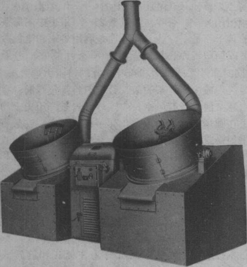 图2 410圆筒式炒干机 电磁内热炒干机 是一种新能源炒茶机。它从根本上改变了锅体外加热的方式, 把低压电源直接加到锅体上, 因大电流通过降压器的副边,由于趋肤效应,增加了锅体的等效电阻, 使之发热。电磁内热炒茶机有锅式和瓶式两个机种: 锅式除由炒锅、变压器、机架等组成外, 还配上锅式杀青机或炒干机的炒手组和炒叶腔; 瓶式由内外两个双锥体组成。内锥体分成24片弧形长条, 每条是一发热元件, 呈等腰梯形, 每两件组成一个低压电回路, 通过交变大电流元件发热。电磁内热炒茶机的动力, 可采用圆盘型直线电动机,也可采用普通电动机,经减速后驱动主轴。 由于电磁内热炒茶机利用锅体趋肤效应而发热,所以它能保持恒温, 又能迅速改变锅温, 符合制茶工艺的要求, 比电热丝炒茶节电约40%左右。 |