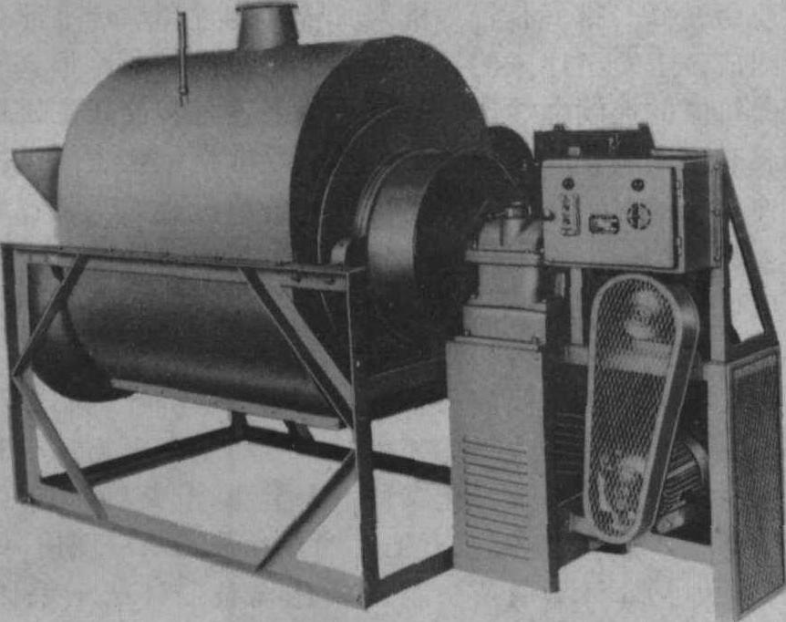图1 484-1炒干机 筒式炒干机 瓶式炒干机 浙江100型瓶式炒干机由转筒、机架、炉灶及转动装置等部分组成。转筒用薄钢板制成广口瓶式壳体, 为两段锥体复合而成,最大直径1米,传动端直径55厘米, 进、出茶端直径80厘米, 两端面外圆有档烟圈。筒体周围向下压有十三条呈三角形断面棱条, 进出茶端锥面上焊有4条螺旋出叶导板, 转筒借两组十字形螺杆撑档和固定器安装在主轴上,主轴安装在两端机架上的滑动轴承中。四翼轴流风扇装在主轴传动的一端的风扇罩内, 减速传动装置是用传动比为1:4.5的齿轮, 通过传动轴减速驱动转筒运转,同时在传动轴上安装一只大直径三角皮带轮, 增速传动风扇壳上的小直径的三角皮带轮, 使风扇转速达到每分钟450转, 借以排出滚筒内产生的水气。由于滚筒需要正转工作, 反转出茶, 所以用一根开口皮带传动, 一根交叉皮带传动, 中间采用牙嵌离合器, 左右拨动改变转向。已改为单机传动的机子,采用换相开关来调换转向, 机架多用角铁制成, 也有木制或水泥制成。炉灶常作拱形, 砖泥砌成, 有炉栅7~9根,吊火距18~22厘米, 柴灶偏高, 用作炒二青则要求通风洞高些, 以加强通风, 用作足干则不必太高。滚筒及炉灶两侧和顶端的间隙为6~8厘米,设两个12(厘米)2的烟道通向烟囱, 烟囱高7米左右。本机通常配用动力为1.1千瓦, 工作转速每分钟22~36转。每次二青投叶量15千克左右, 足干投叶量25千克左右。 110转筒炒干机 机器由转筒体、机架、炉灶和传动等部分组成。筒体由2~2.5毫米钢板卷焊而成, 一端为圆柱体, 另一端为圆锥体, 圆柱体部分的直径为1.1米, 长为1米,圆锥体部分, 大端直径为1.1米, 小端直径为85厘米. 长30厘米, 即筒体总长为1.3米, 两端面分别焊有外径为105厘米和90厘米的档烟圈。筒体内壁上, 有两条相距120°, 半径为5厘米的半圆形突棱, 在圆锥体部分的筒壁上有四条与轴线成45°,等距分布的出茶板。筒体借助八根双头螺柱和两个十字结头固定在主轴上, 主轴两端伸出筒体两端面, 由轴承固定在角铁支承机架上。动力通过三角皮带传动减速使筒体产生转速为22~24转/分, 并由离合器或倒顺开关, 使滚筒产生正转工作或反转出茶。工作中, 筒体内壁上的半圆形突棱和三角形螺旋凸起(与轴线平行的一面)把茶叶带到一定高度后因重力作用下滑,增加茶叶与筒体内壁和热空气接触机会,加速干燥, 茶叶在半圆形突棱与筒体相邻的沟槽中,受到轻微挤搓, 有一定紧条作用, 本机技术参数为:滚筒工作转速炒毛胚时为20~24转/分。用作炒干时为12~16转/分, 投叶量揉捻叶为25千克或胚叶40~45千克, 台时产量为50千克干毛茶。 圆筒式炒干机 机器由筒体, 排湿装置、机架、炉灶和传动等部份组成 (图2)。筒体是主要工作部件,机架由板焊结构支承滚筒, 电动机通过三角皮带和蜗轮、齿轮减速驱动筒体旋转。该机主要型号有CCT-80型和湘新式60型, 主要技术规格: CCT-80型为:圆筒长度1.2米,圆筒直径为80毫米,工作转速40转/分,出叶转速18转/分, 台时产量为30千克。该机炉腔为上下两部分, 包围滚筒体四周, 并用夹层绝热,上炉腔顶部连接烟囱, 下炉腔下部与炉灶联连, 进出茶装置位于滚筒前端, 并在排湿风扇处设集尘装置;湘新式60型圆筒炒干机的筒体长1米,筒径为60厘米。